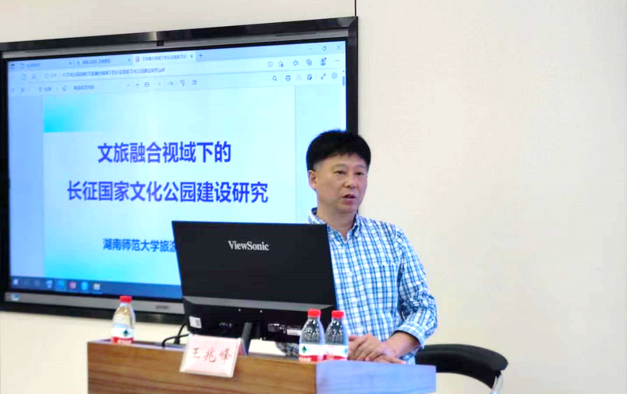 5月17日下午,湖南师范大学旅游学院院长、湖南省旅游研究院院长王兆峰教授做客mg冰球突破试玩第121期“李达讲坛”,为mg冰球官网师生带来了一场题为“文旅融合视域下长征国家文化公园建设研究”的精彩学术报告。讲坛由副院长刘民坤教授主持。