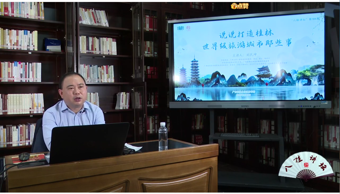 2022年5月14日上午,mg冰球官网刘民坤教授应邀做客广西壮族自治区图书馆“八桂讲坛”,以“说说打造桂林世界级旅游城市那些事”为题进行了学术分享。“八桂讲坛”是广西壮族自治区图书馆为广大读书爱好者打造的公益性讲坛,至今已经举办了700多期。受到疫情影响,本次讲坛以线上直播的方式进行。