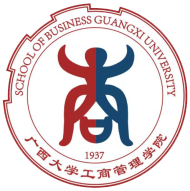 主体造型:图案沿用了学院LOGO的主体造型,以广西本土特色花山岩画的人形(主要是壮族先民骆越人的形象)构成的“商”字。商字上面的角为广西特有的水牛角,商字里面的“口”类似于聚宝盆。